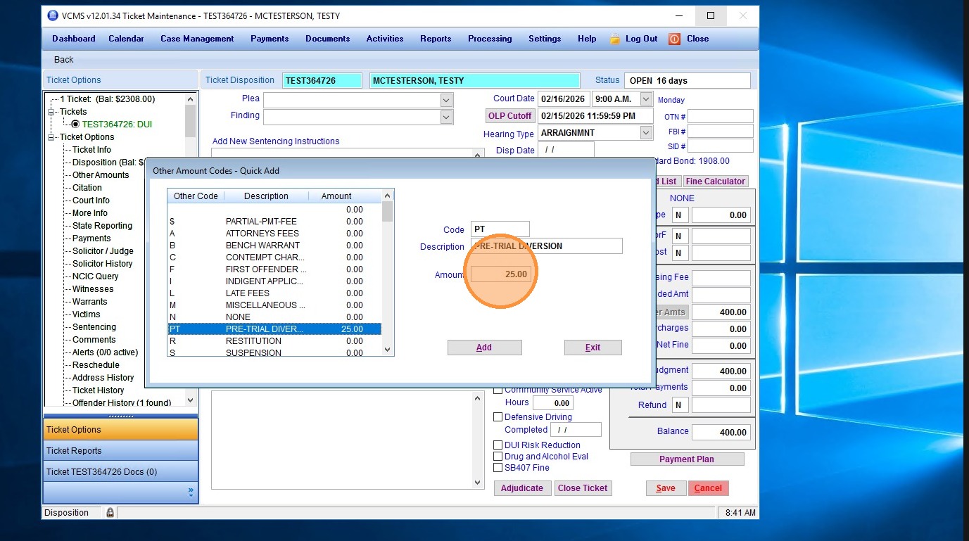 2. Select the same "Pre-Trial" other amount that was used for the original fee.