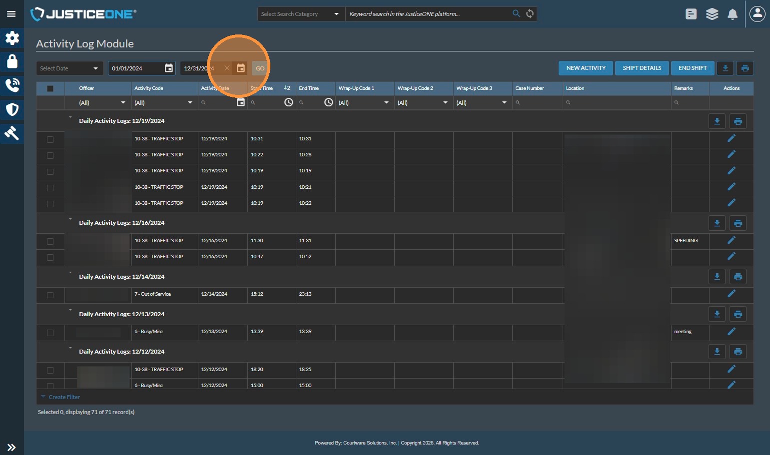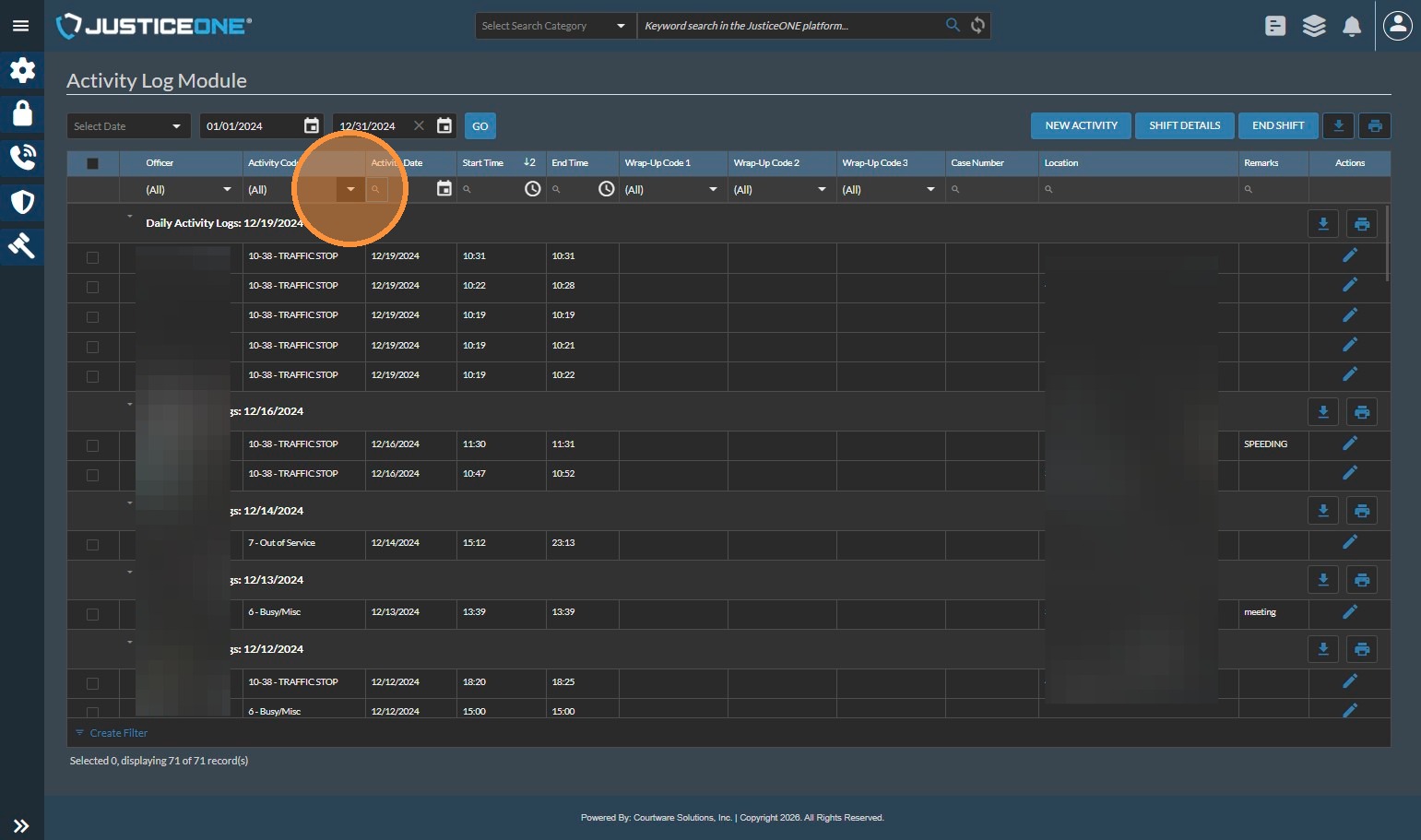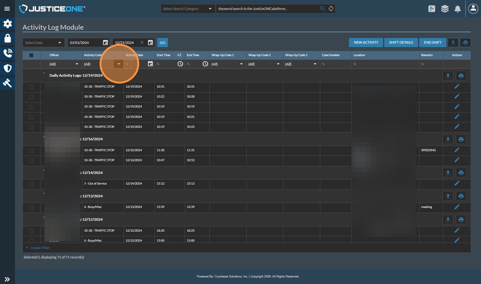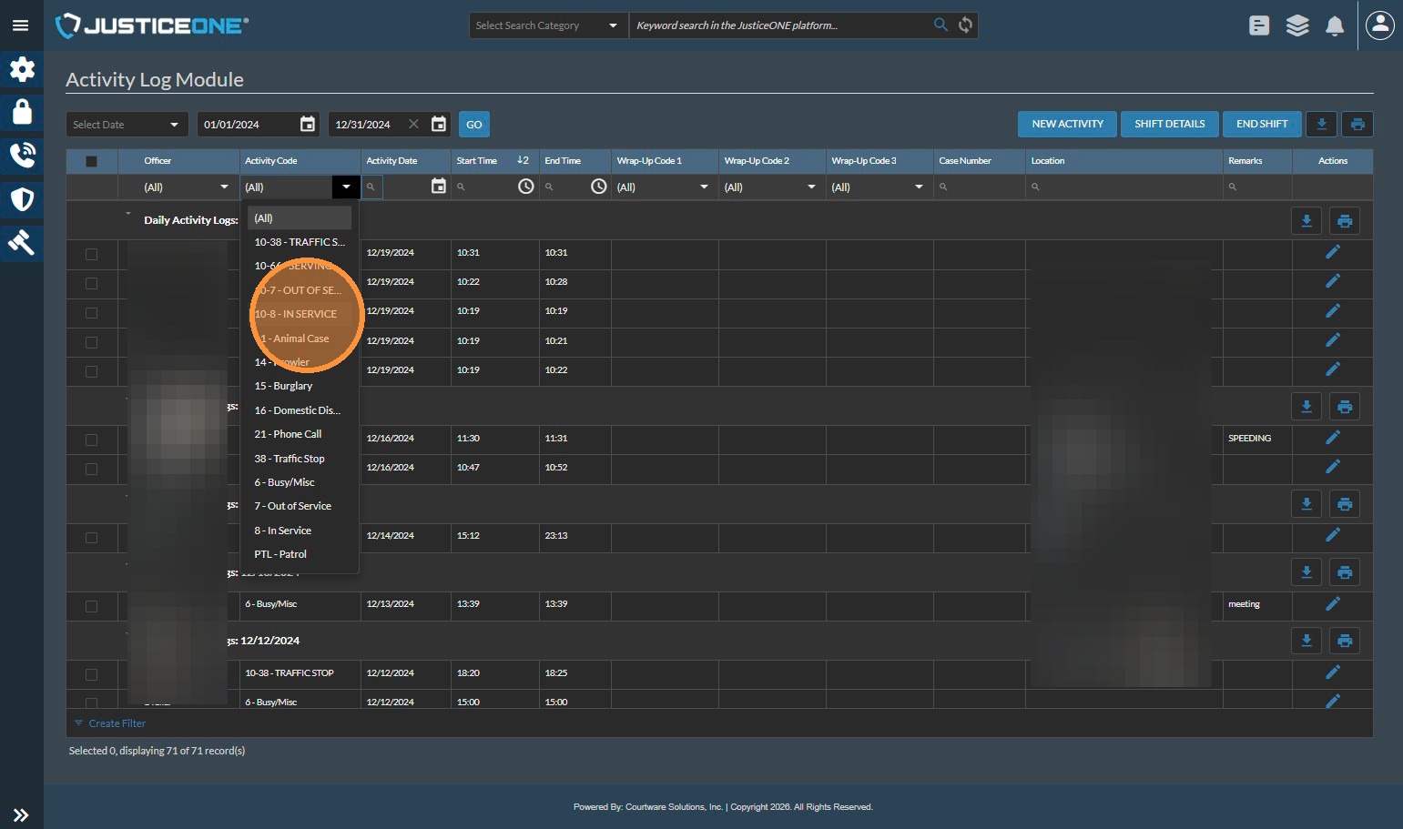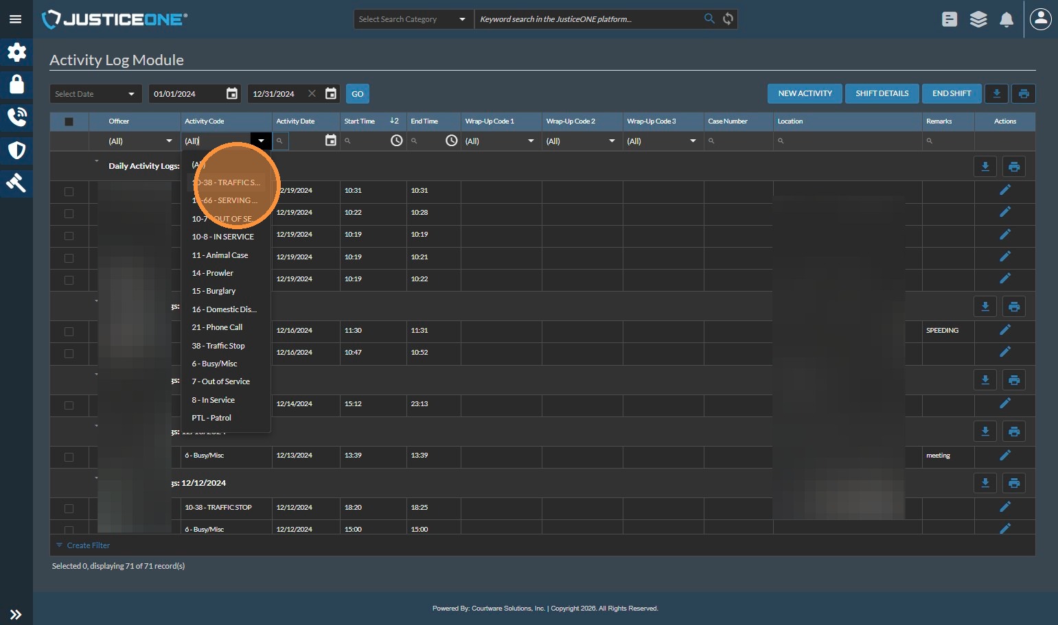 The Officer Statistics Report in JusticeONE RMS provides a summary of activity for a single officer through any specified time period. To run the report, follow the directions below: 1. From anywhere in JusticeONE, click "Records" 2. Click "Reports ...