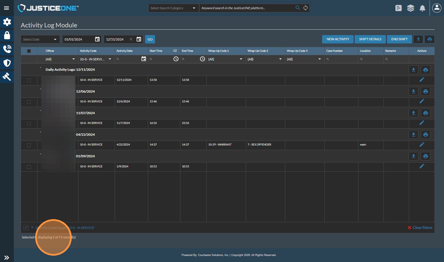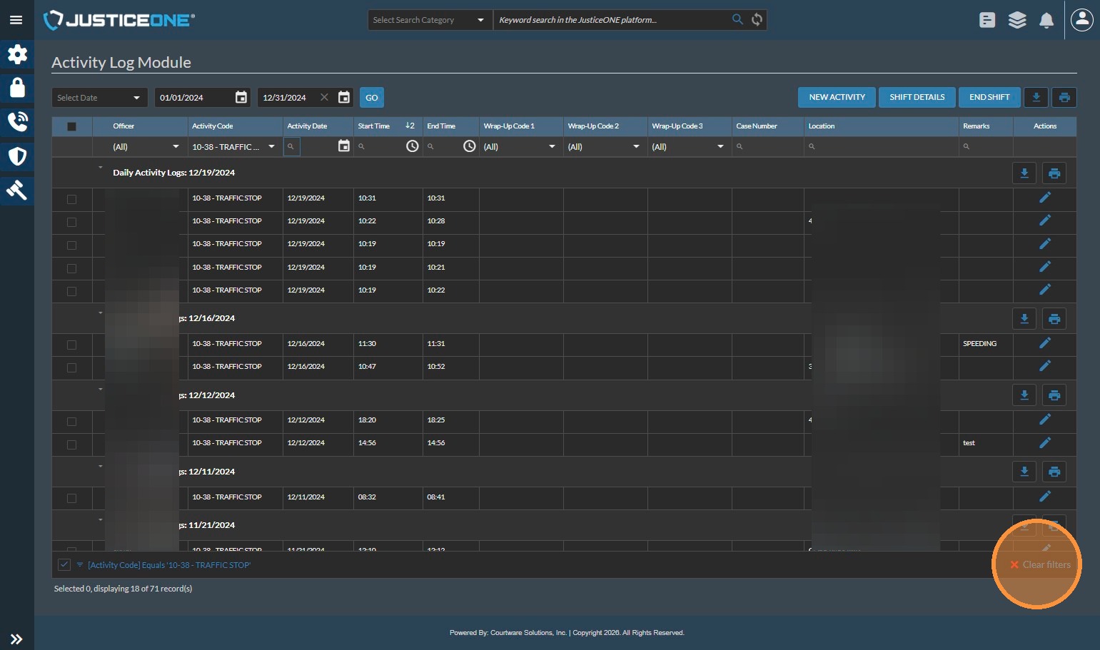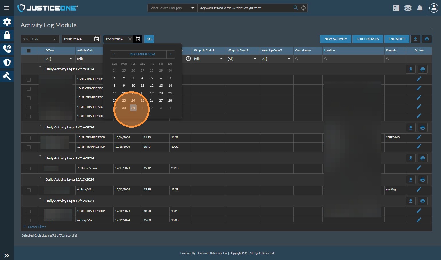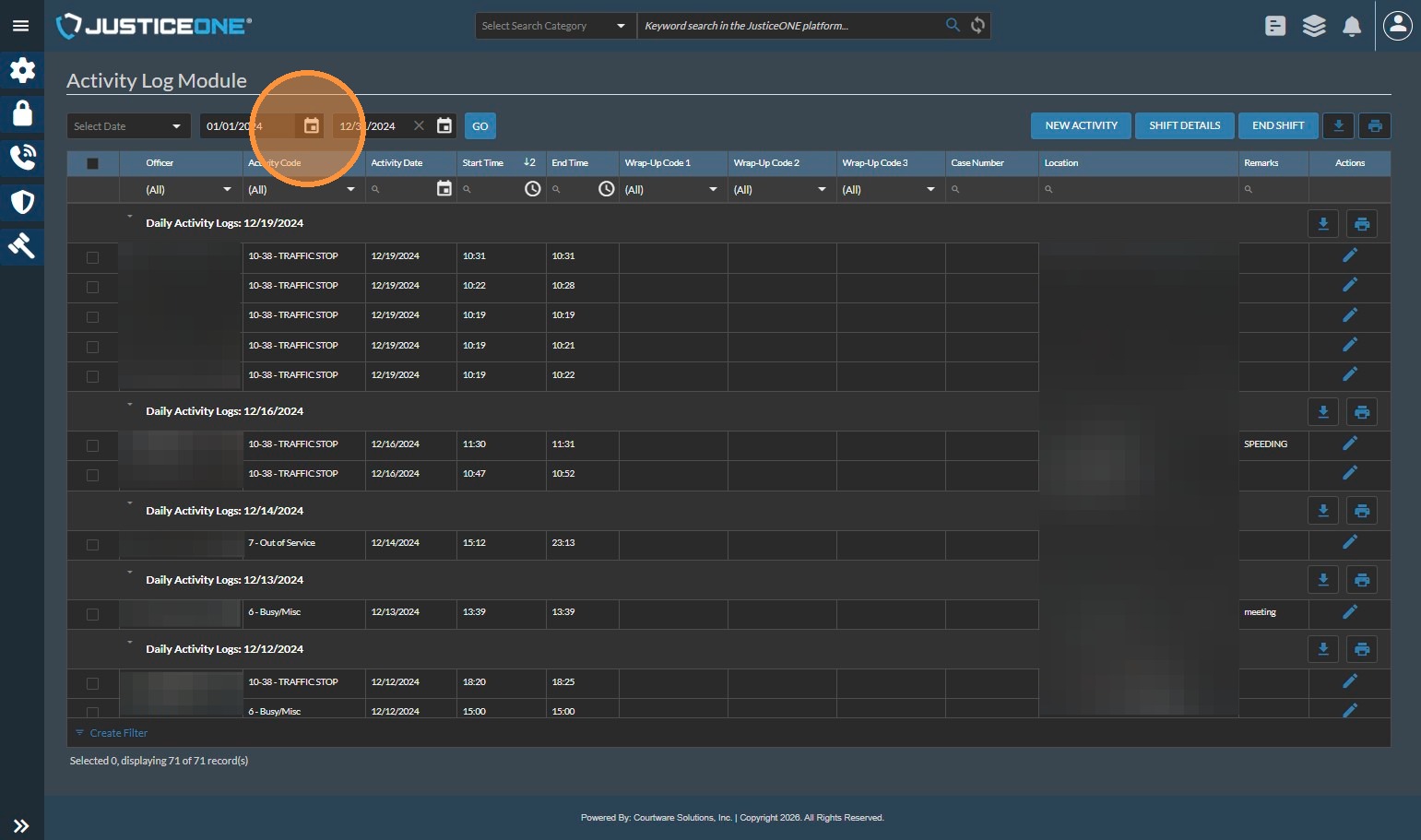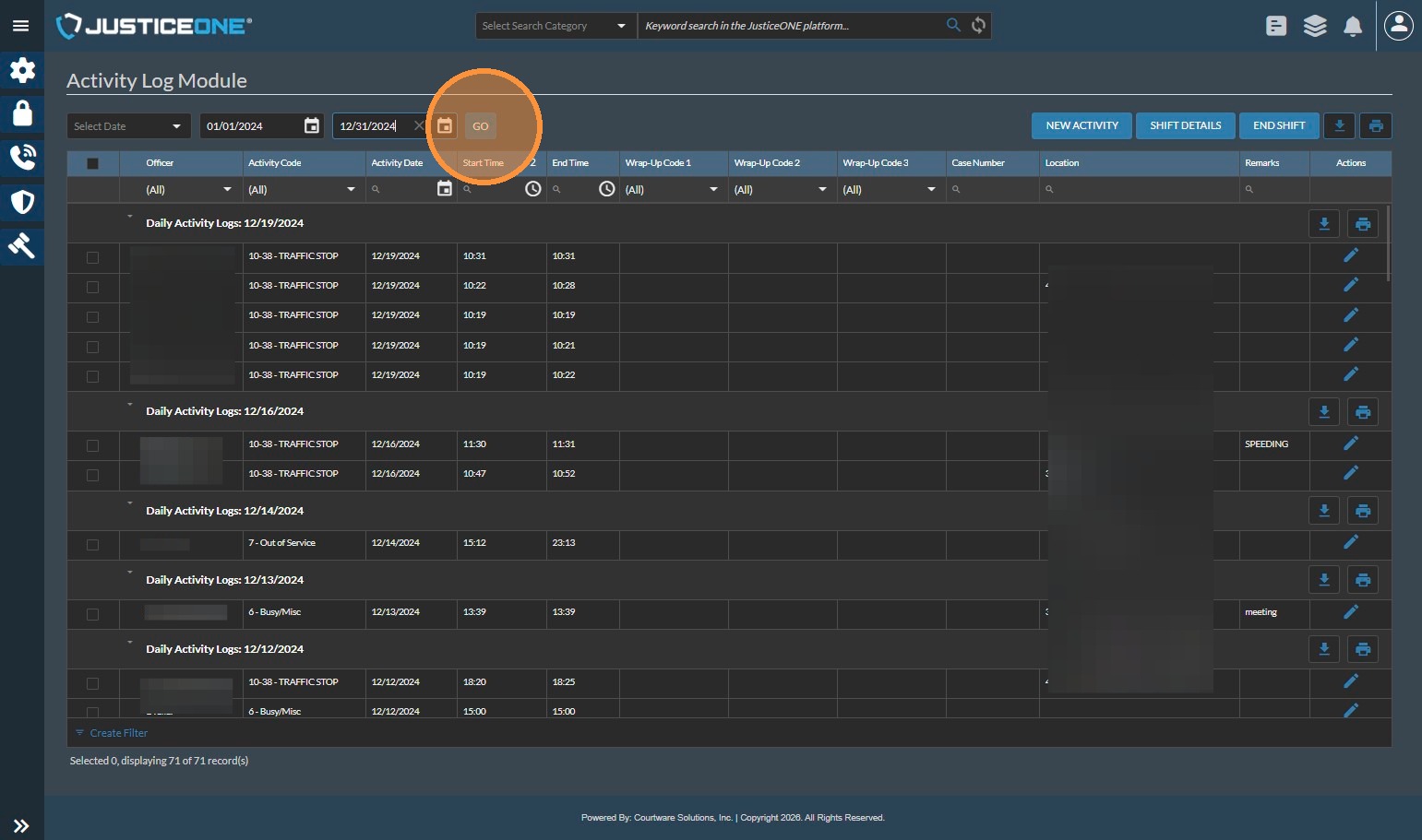 The Officer Statistics Report in JusticeONE RMS provides a summary of activity for a single officer through any specified time period. To run the report, follow the directions below: 1. From anywhere in JusticeONE, click "Records" 2. Click "Reports ...