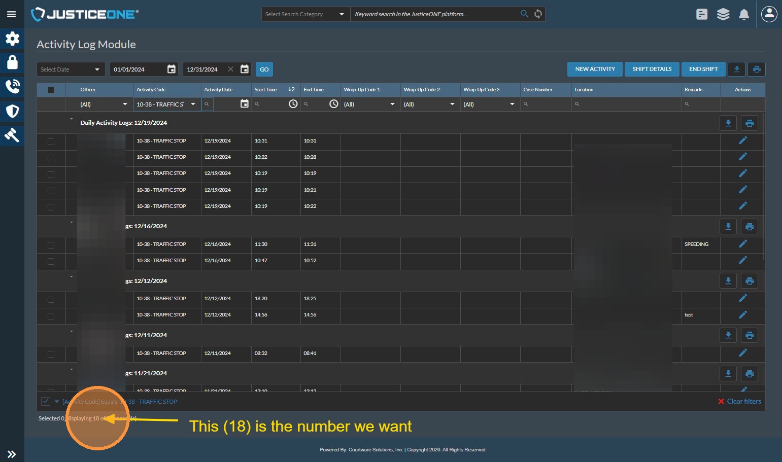 11. Once the list is filtered, you can read how many records exist in the number at the bottom of the screen. In this example, there are 18 records that match the filter, so you would report "18" for this line item.