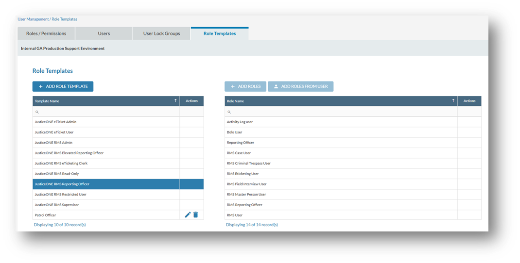 The “Role Templates” section allows users to utilize prebuilt role templates to assign to users. This can be used as a guide to create roles for new users. Another feature in this section is the “Add Roles from User.” Once a new user is created and roles assigned, the roles can be assigned using the previously made user profile. For example, once one RMS reporting officer is created and the roles are assigned, additional users can be added, and the role can be duplicated.
